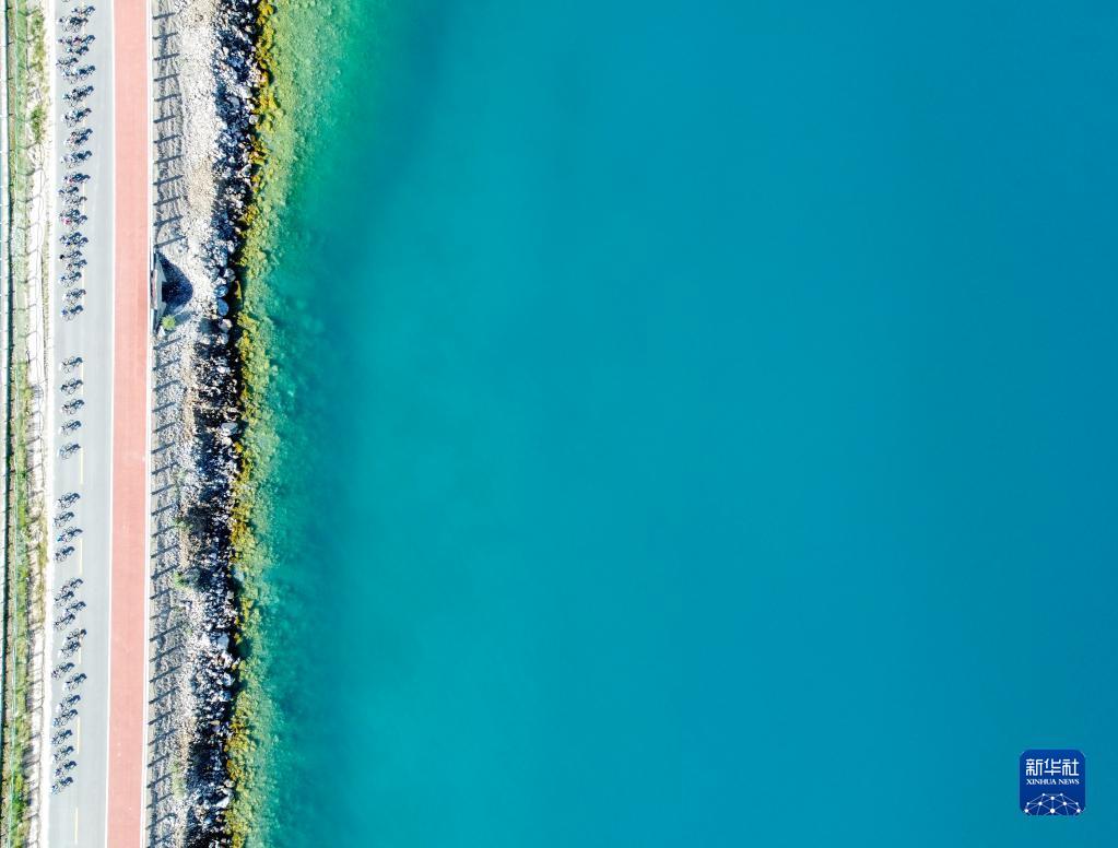 2022年7月26日,參賽選手在比賽中(無(wú)人機拍攝)。當日,中國新疆第14屆環(huán)賽里木湖公路自行車(chē)賽落下帷幕。