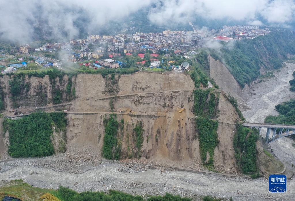 2022年9月9日,搶險人員在搶通磨西鎮附近道路(無(wú)人機照片)。四川瀘定磨西鎮出現降雨,加大了災區道路搶通搶險難度。