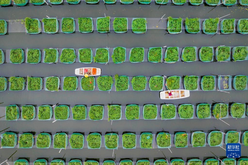 2022年11月12日,湖北省孝感市云夢(mèng)縣開(kāi)發(fā)區和平村村民在池塘中喂養黃鱔(無(wú)人機照片)。