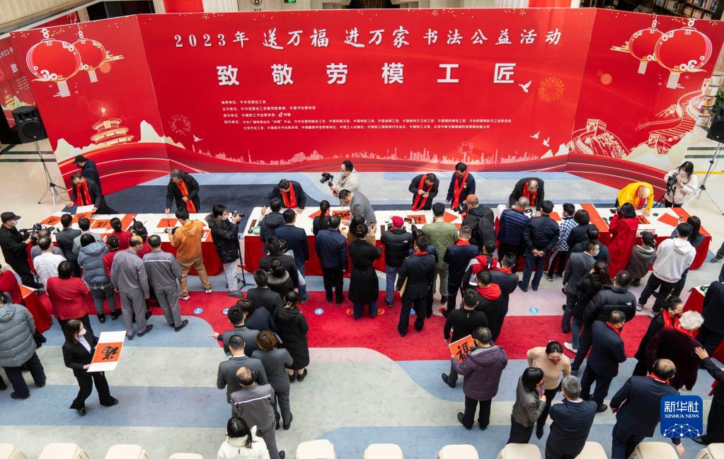 當日,由中華全國總工會(huì )指導,全國總工會(huì )宣教部、中國書(shū)法家協(xié)會(huì )主辦的2023年“送萬(wàn)福、進(jìn)萬(wàn)家”首場(chǎng)示范書(shū)法公益活動(dòng)——“致敬勞模工匠”專(zhuān)場(chǎng)活動(dòng)在京舉行,出席活動(dòng)的多位書(shū)法家揮毫潑墨,為勞動(dòng)模范、大國工匠代表等一線(xiàn)職工書(shū)寫(xiě)春聯(lián)和福字,表達新年的問(wèn)候與祝福。
