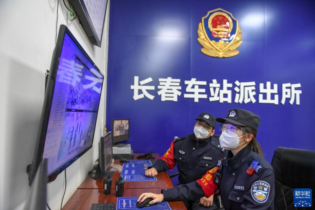 1月9日,在長(cháng)春鐵路公安處長(cháng)春車(chē)站派出所,朱榮超(右)與同事察看監控畫(huà)面。