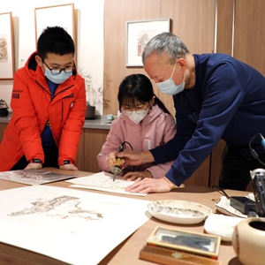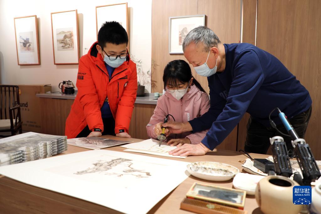 1月9日,在石家莊市灣里廟步行街郝友友民間文藝家工作室,烙畫(huà)藝術(shù)家郝友友(右)指導孩子們學(xué)習烙畫(huà)技藝。