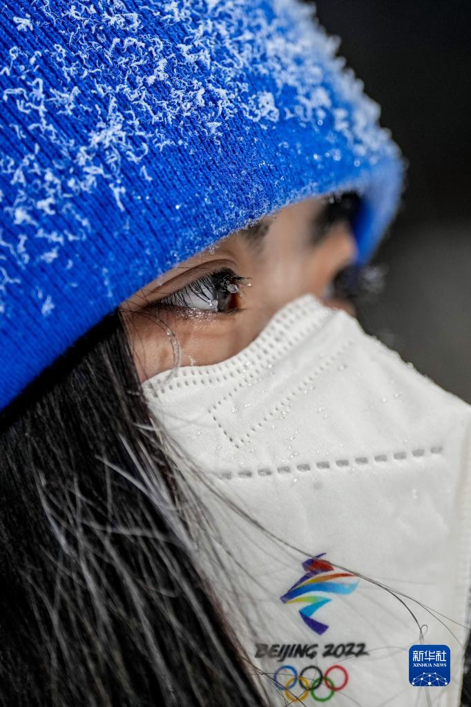 2022年2月9日晚,在國家越野滑雪中心,一位冬奧會(huì )志愿者的睫毛上結出冰珠。