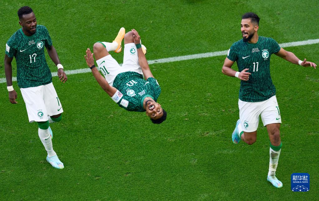 2022年11月22日,沙特阿拉伯隊球員薩勒姆-達瓦薩里(中)在打入球隊第二粒進(jìn)球后慶祝。