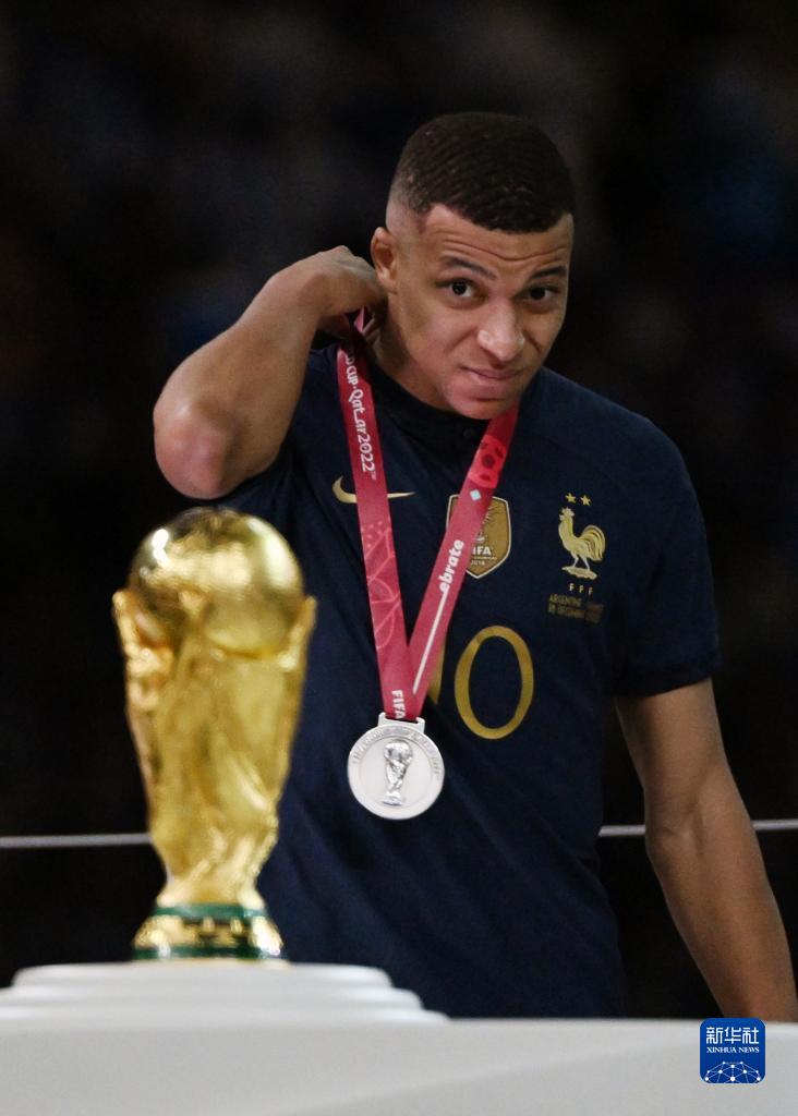 2022年12月18日,獲得世界杯金靴獎的法國隊球員姆巴佩在頒獎儀式上注視大力神杯。