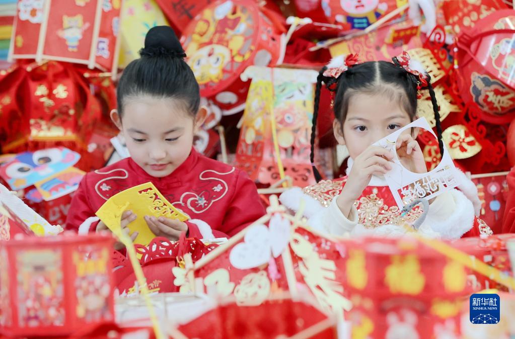 1月9日,浙江省湖州市德清縣雷甸鎮中心小學(xué)學(xué)生在制作燈籠。