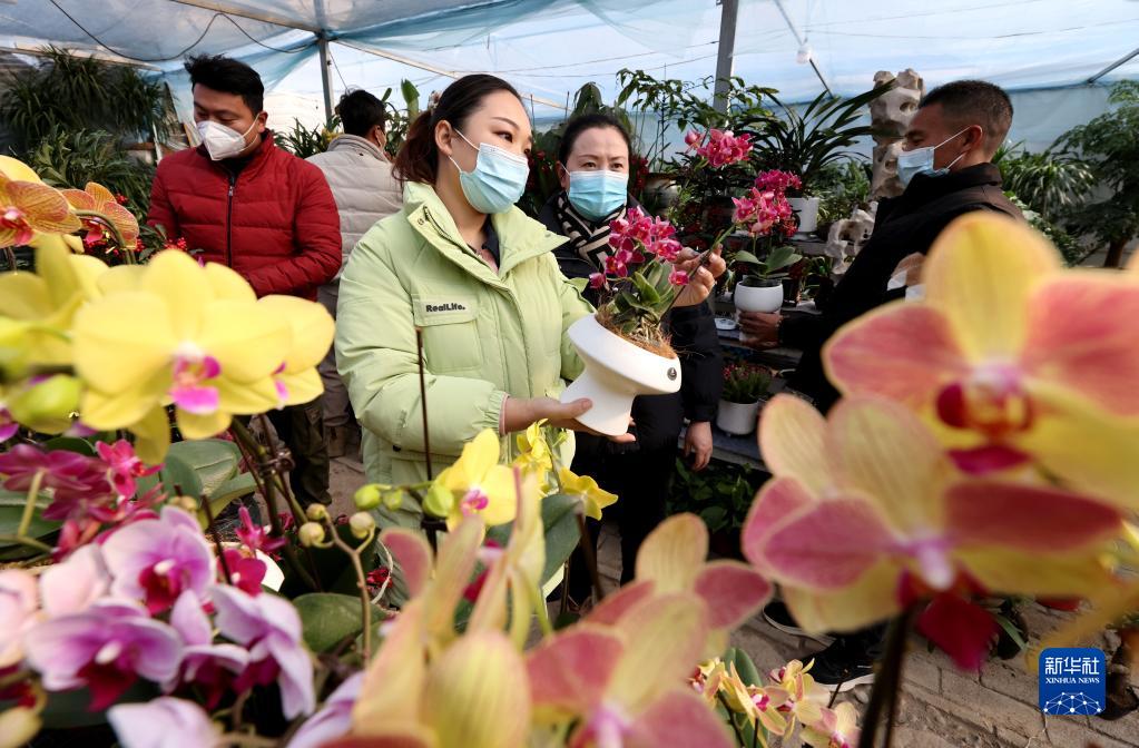 1月9日,人們在山東省棗莊市齊村花卉苗木基地選購蝴蝶蘭。