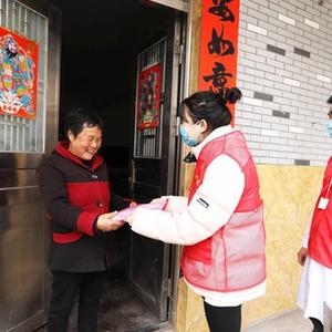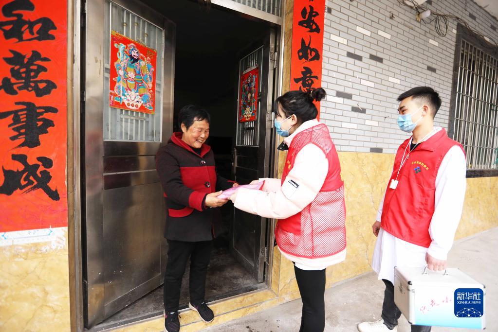 1月9日,在赤水市文華街道望城社區,醫護人員和黨員志愿者為老人發(fā)放防疫“健康包”。