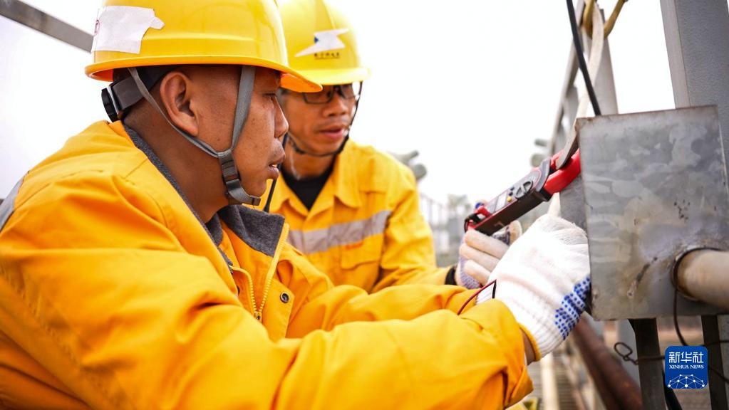 1月9日,中國鐵路南寧局集團有限公司南寧動(dòng)車(chē)所的接觸網(wǎng)工在燈橋上排查電力線(xiàn)路。