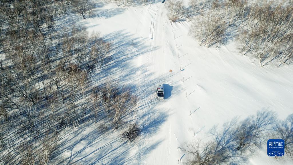 1月9日,西烏珠穆沁旗公安局古日格斯臺國家級自然保護區迪彥派出所民警駕駛警車(chē)在林區巡邏(無(wú)人機照片)。