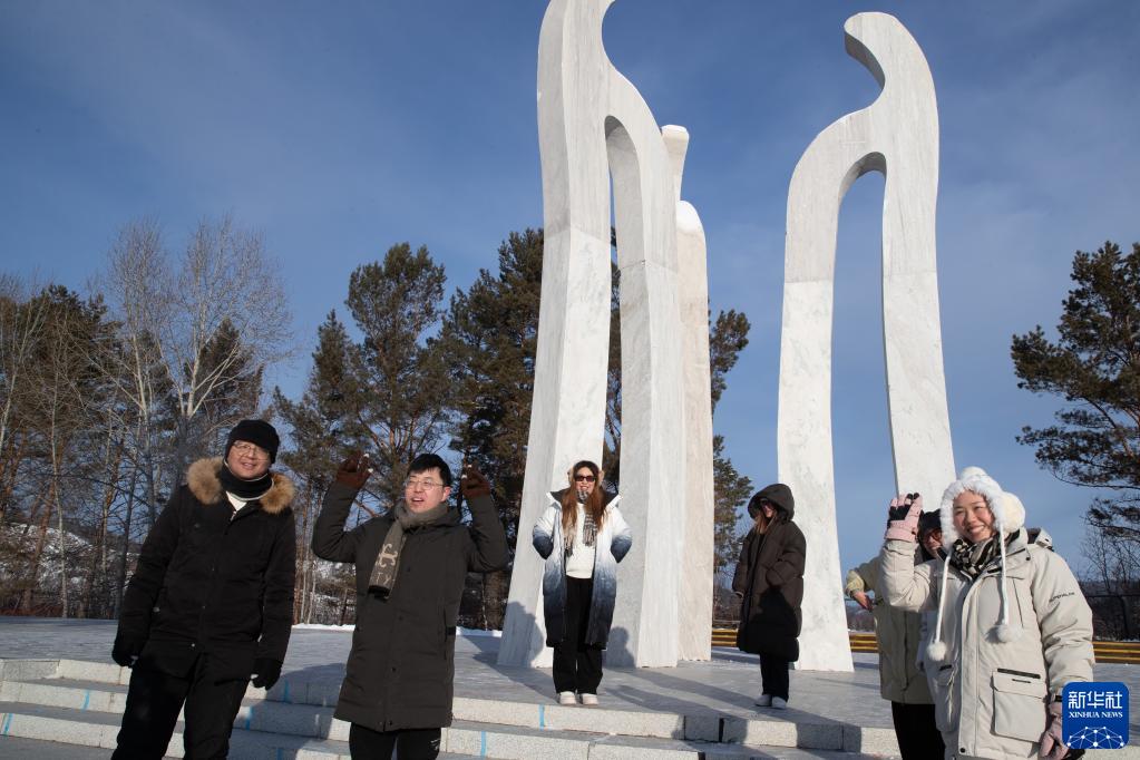 1月10日,游客在漠河市北極村北字廣場(chǎng)游玩。