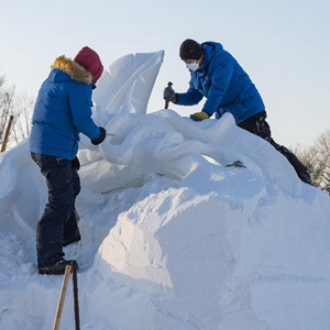 1月10日,在哈爾濱太陽(yáng)島雪博會(huì )園區,參賽選手進(jìn)行雪雕創(chuàng )作。