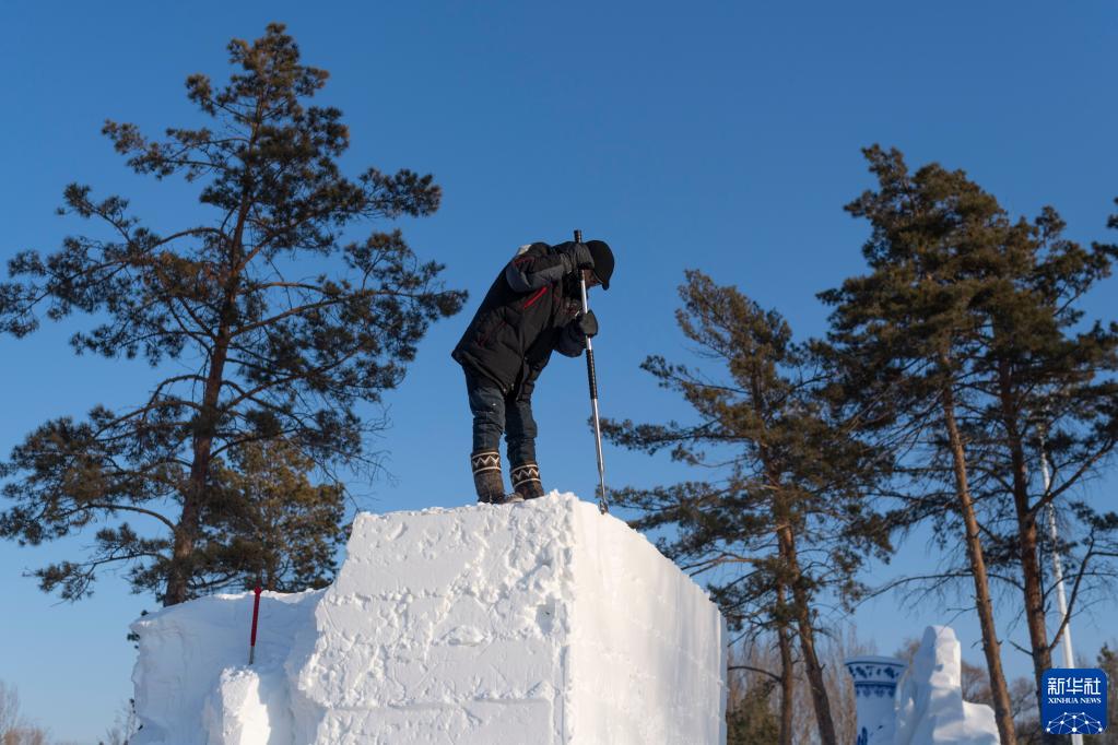 1月10日,在哈爾濱太陽(yáng)島雪博會(huì )園區,參賽選手進(jìn)行雪雕創(chuàng )作。