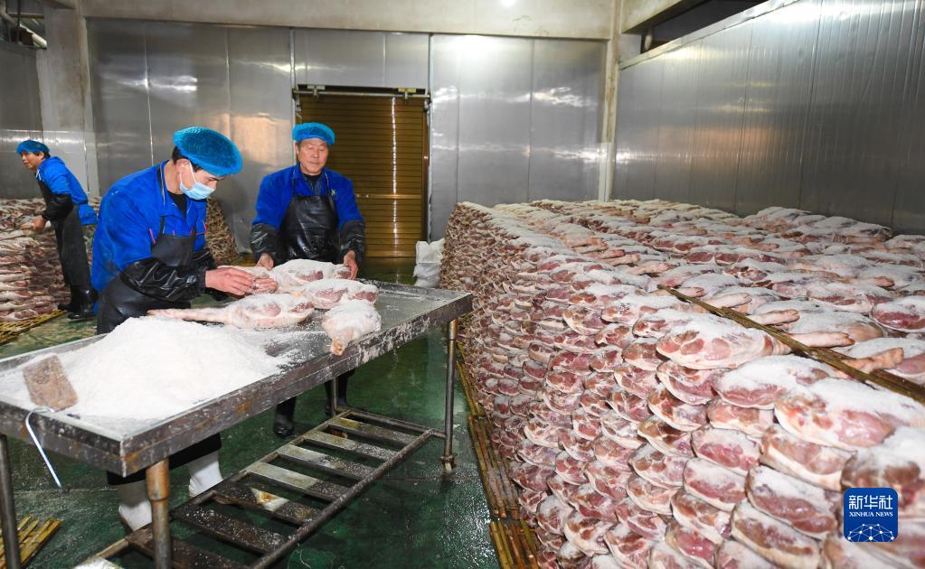 1月10日,在金華市婺城區雅畈鎮一家企業(yè),工作人員在腌制火腿。