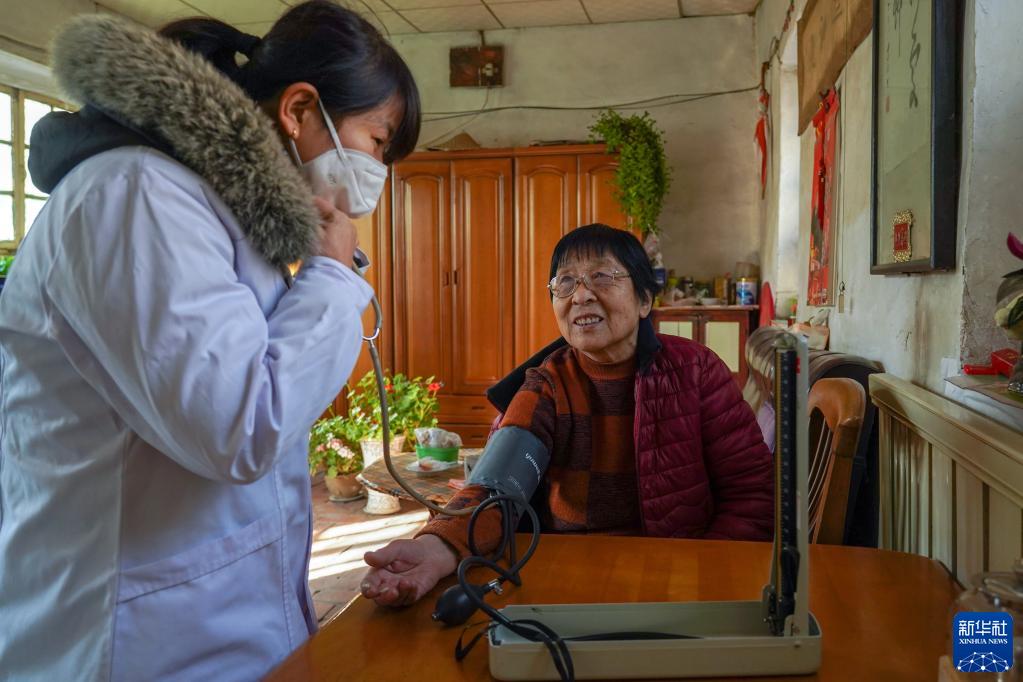 1月10日,山東省濟南市長(cháng)清區大崮山村衛生室全科醫生王玉新上門(mén)為74歲的王成蘭老人檢查身體。