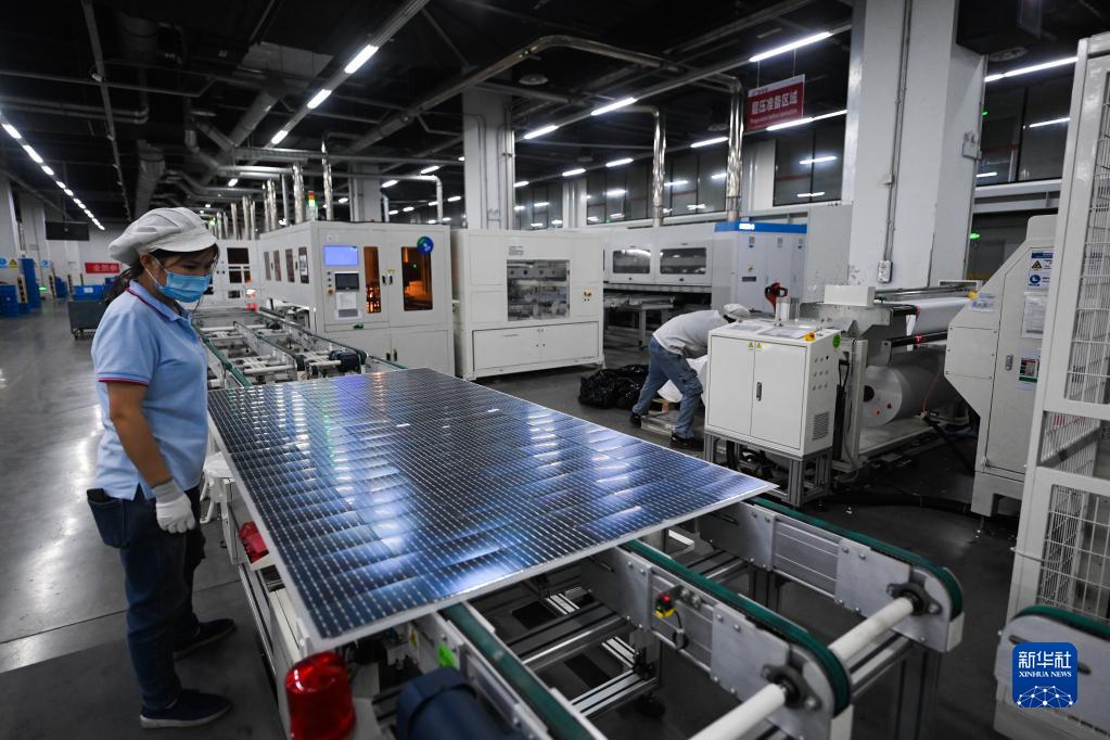 1月10日,在位于嘉興秀洲光伏小鎮內的一家科技有限公司,工人在查看剛生產(chǎn)出來(lái)的光伏設備組件。