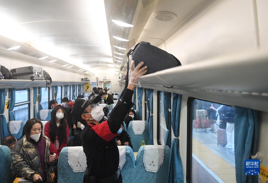 1月10日,覃業(yè)民幫旅客將行李放到行李架上。