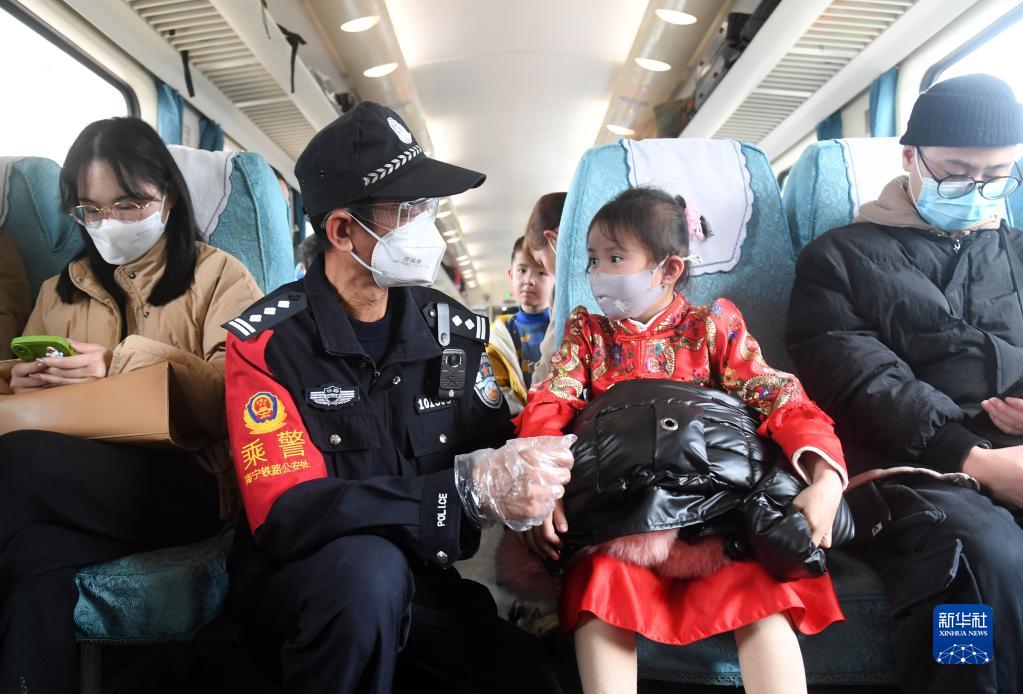 1月10日,覃業(yè)民在列車(chē)上和一名小朋友交流。