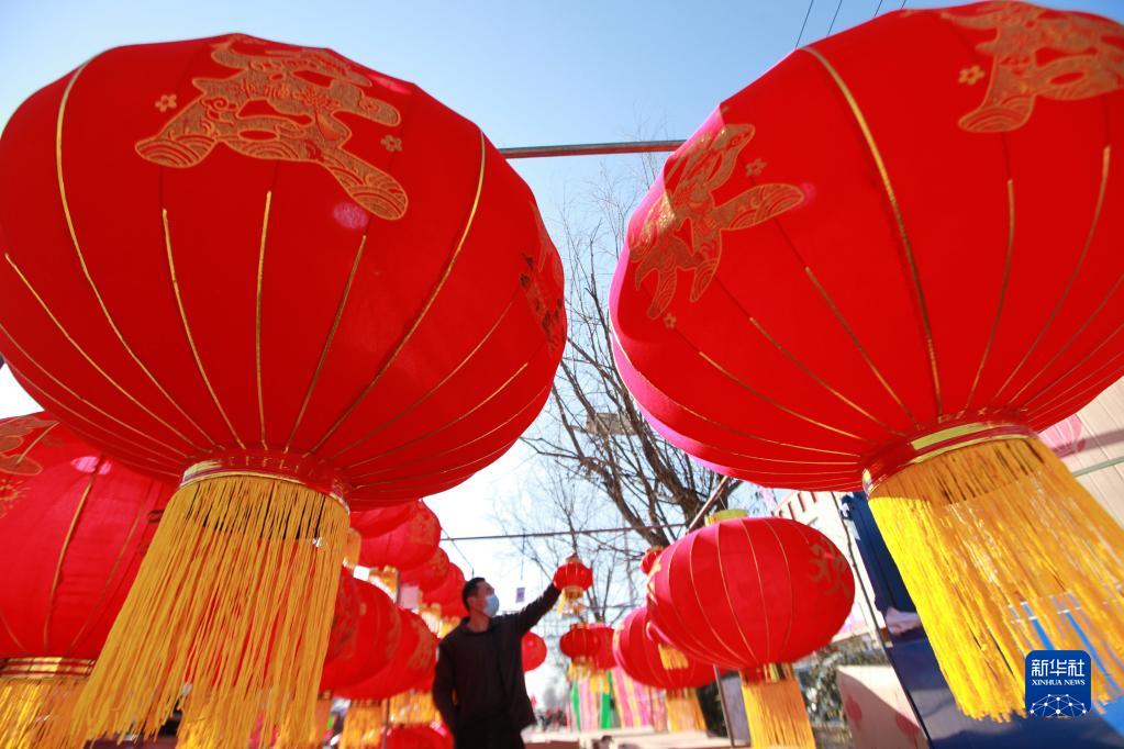 1月10日,在山東省臨沂市平邑縣地方鎮,人們在年貨大集上選購大紅燈籠。