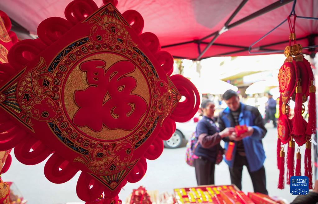 1月10日,人們在貴州省黔東南苗族侗族自治州丹寨縣年貨市場(chǎng)選購春節飾品。