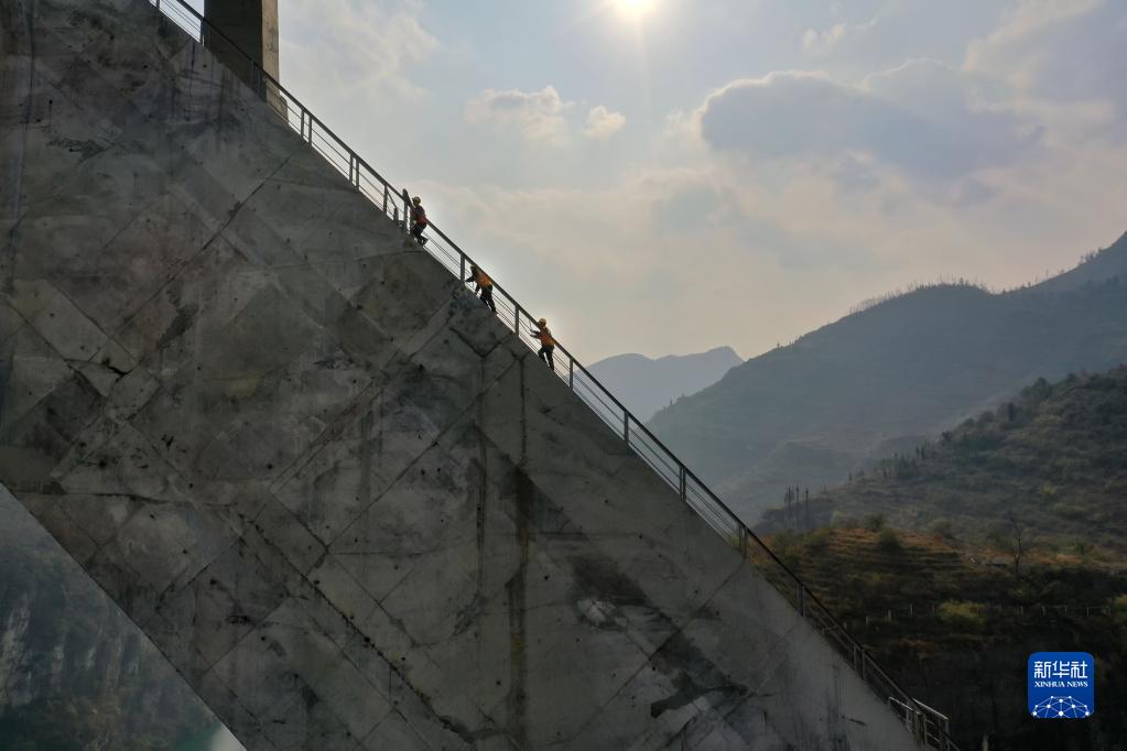 1月10日,貴陽(yáng)高鐵工務(wù)段工作人員在大橋上攀爬(無(wú)人機照片)。