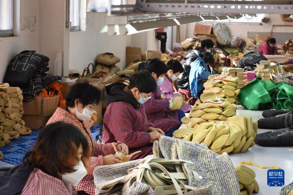 1月10日,平度市新河鎮瑞龍工藝品廠(chǎng)職工在加工草編。