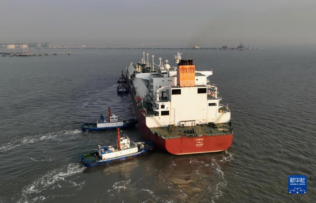 1月11日,一艘LNG船在拖輪的協(xié)助下向唐山港曹妃甸港區中石油液化天然氣接收站碼頭靠泊(無(wú)人機照片)。
