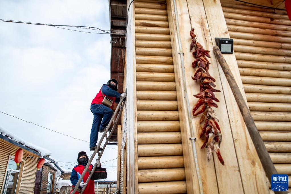 1月9日,在漠河市北極村,線(xiàn)路設備運維人員代洪濱(右)和馬國軍在檢查設備。新華社記者 張濤 攝
