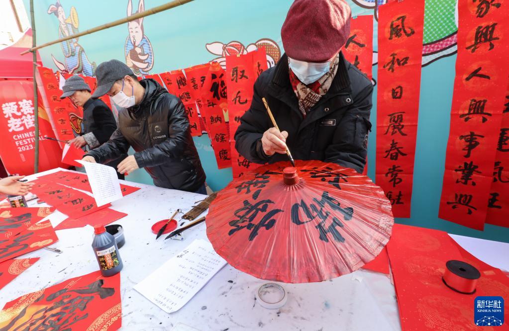 1月11日在杭州市余杭區瓶窯鎮瓶窯老街年貨節上拍攝的寫(xiě)春聯(lián)、送祝?;顒?dòng)現場(chǎng)。