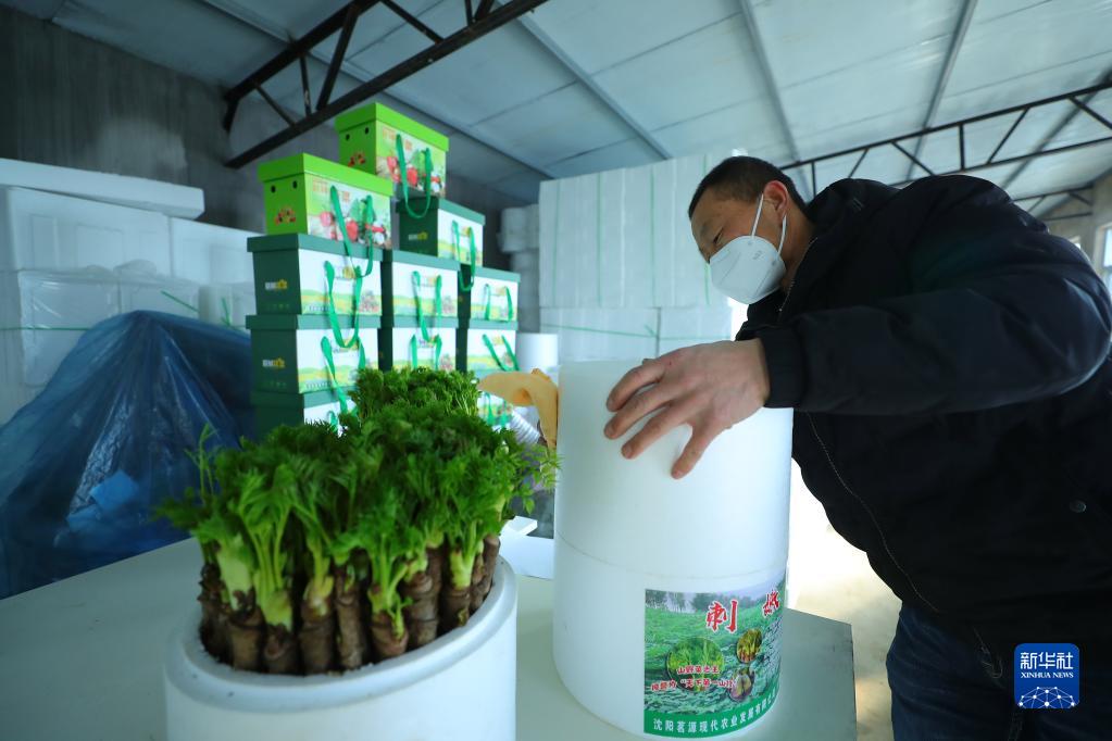 1月9日,在新民市大民屯鎮毓寶臺村大棚里,農民在包裝刺嫩芽盆栽。