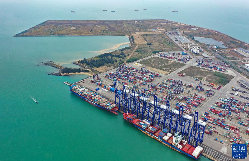 這是1月11日拍攝的海南洋浦區域國際集裝箱樞紐港擴建工程所在地(無(wú)人機照片)。