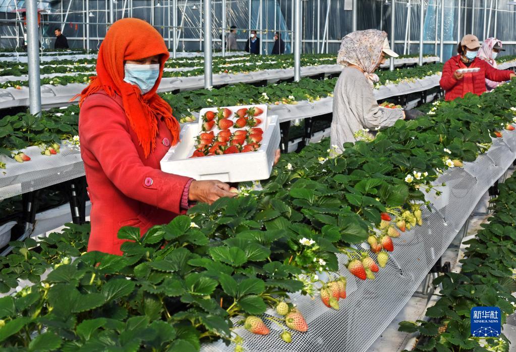 1月11日,山東省平度市舊店鎮東店子村村民在智能溫室采摘草莓。