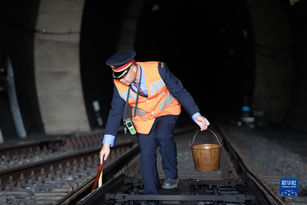 毛忠輝在給道岔刷油養護(1月11日攝)。