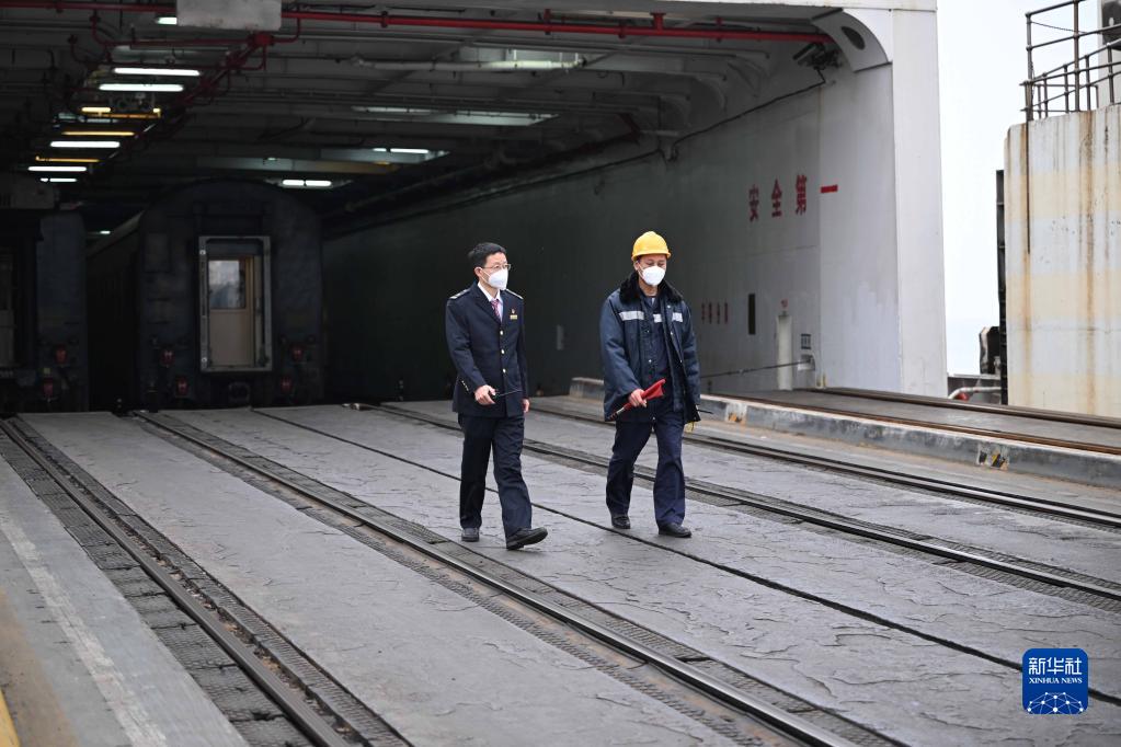 在廣東徐聞的粵海鐵路輪渡北港碼頭,熊美周(左)在火車(chē)棧橋上和同事一起工作(1月8日攝)。