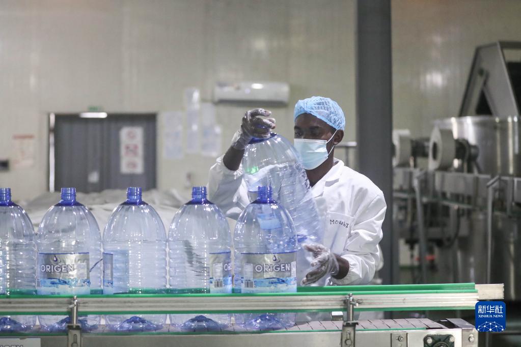 2023年1月2日,在加蓬首都利伯維爾的恩考克經(jīng)濟特區,當地工人在一家中國純凈水公司工作。