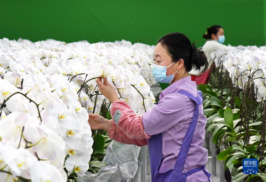 1月11日,在平度市舊店鎮一花卉種植基地內,花工在整理蝴蝶蘭。