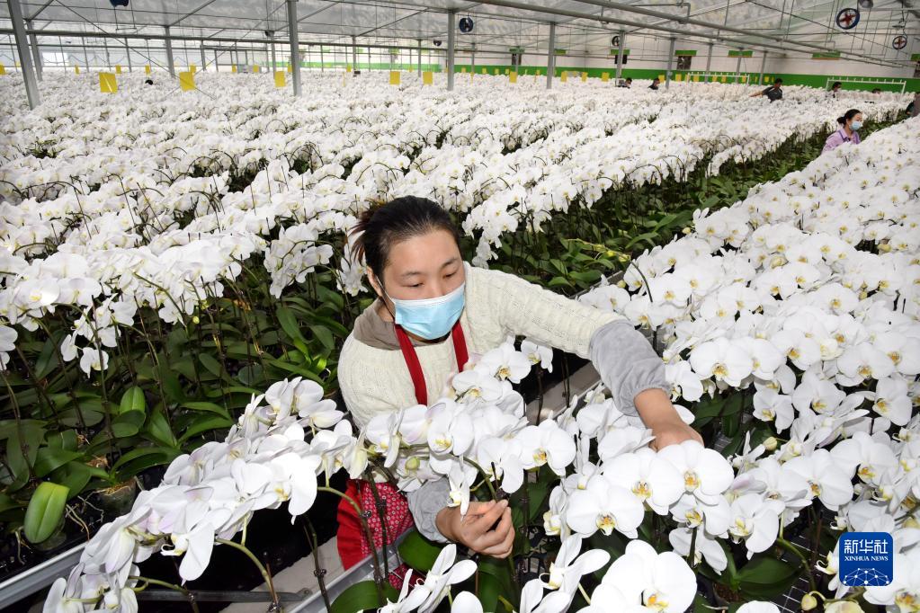 1月11日,在平度市舊店鎮一花卉種植基地內,花工在整理蝴蝶蘭。