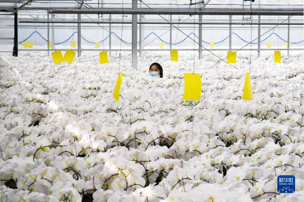 1月11日,在平度市舊店鎮一花卉種植基地內,花工在整理蝴蝶蘭。