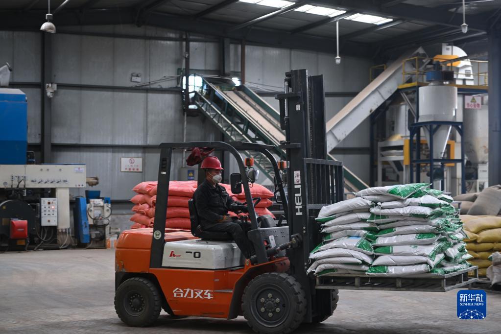 1月12日,青海省剛察縣一家飼料生產(chǎn)企業(yè),工人使用叉車(chē)搬運成品飼料。