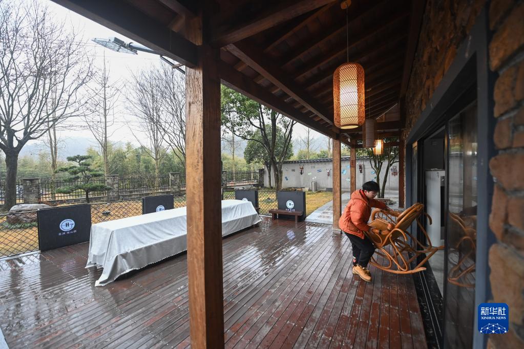 1月13日,在浙江省杭州市臨安區太湖源鎮橫徐村,呂康在自己開(kāi)辦的民宿外調整桌椅擺設。