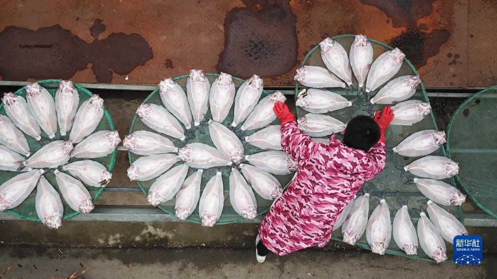 在岳陽(yáng)市君山區錢(qián)糧湖鎮六門(mén)閘社區生態(tài)漁村,居民在晾曬魚(yú)干(1月12日攝 ,無(wú)人機照片)。