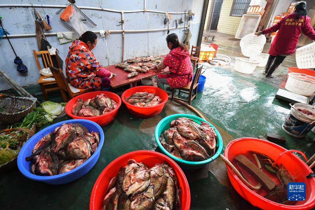 在岳陽(yáng)市君山區錢(qián)糧湖鎮六門(mén)閘社區生態(tài)漁村,居民在剖魚(yú)(1月12日攝)。