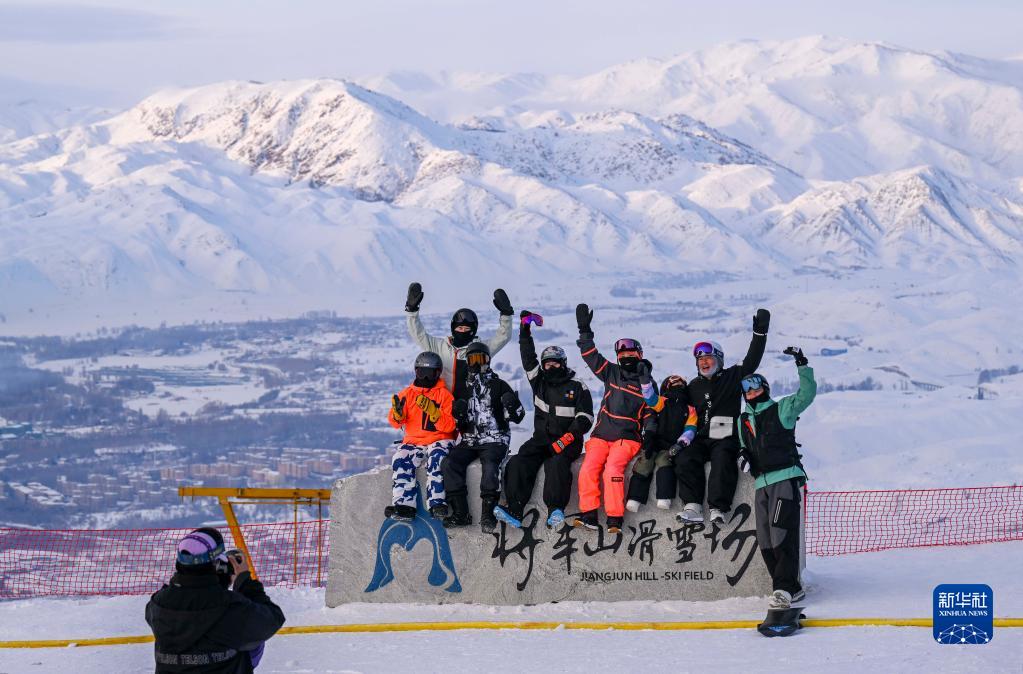 游客在新疆阿勒泰市將軍山滑雪場(chǎng)合影留念(2022年12月30日攝)。