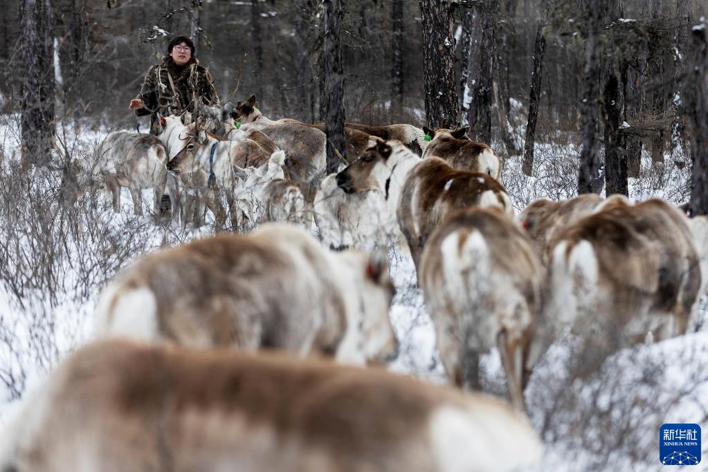 1月12日,覺(jué)樂(lè )召喚鹿群,想讓鹿群和自己一起返回馴鹿點(diǎn)。今年的雪特別大,苔蘚藏得很深,覺(jué)樂(lè )怕鹿群吃不飽,想到馴鹿點(diǎn)喂它們吃一些豆餅。新華社記者 費茂華 攝
