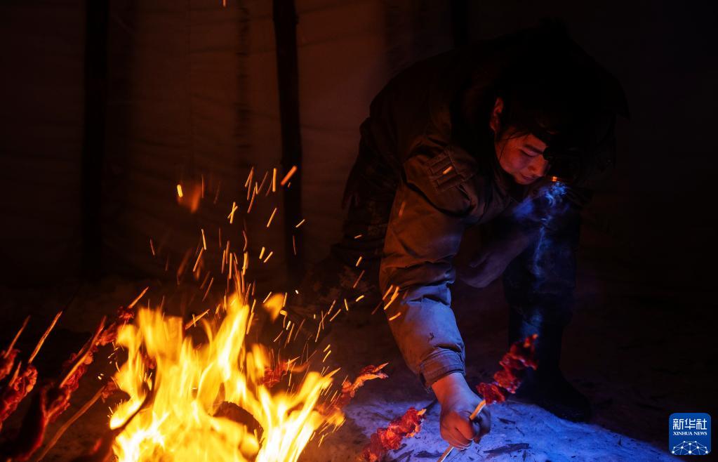 1月11日,覺(jué)樂(lè )的表弟達林瑪烹制鄂溫克傳統烤肉作為晚飯。新華社記者 費茂華 攝