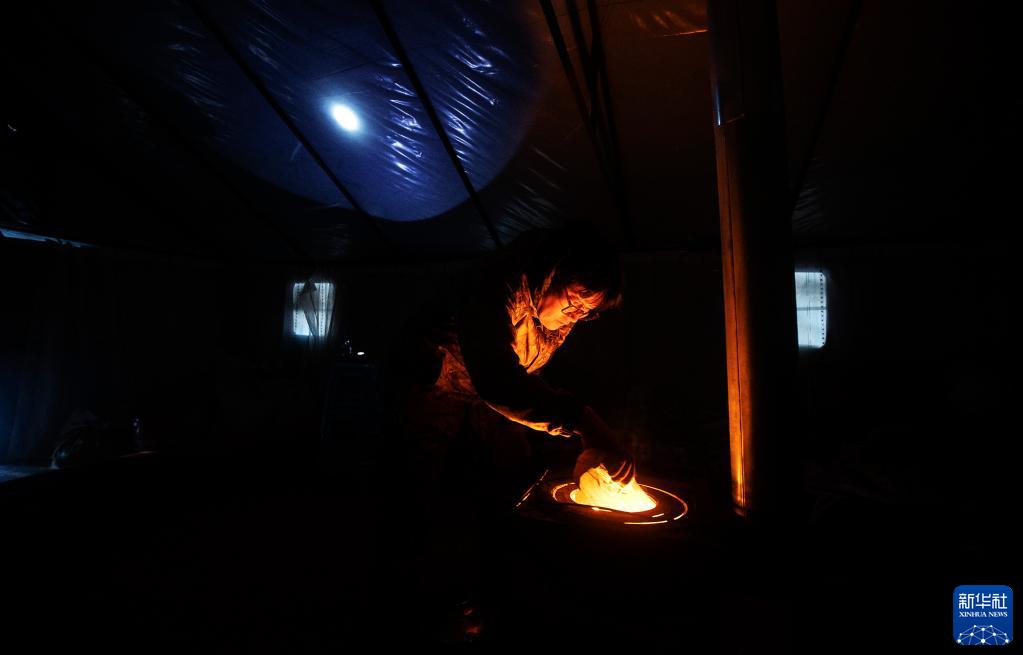 1月12日,天還沒(méi)亮,覺(jué)樂(lè )在帳篷里燒火準備煮奶茶。新華社記者 費茂華 攝