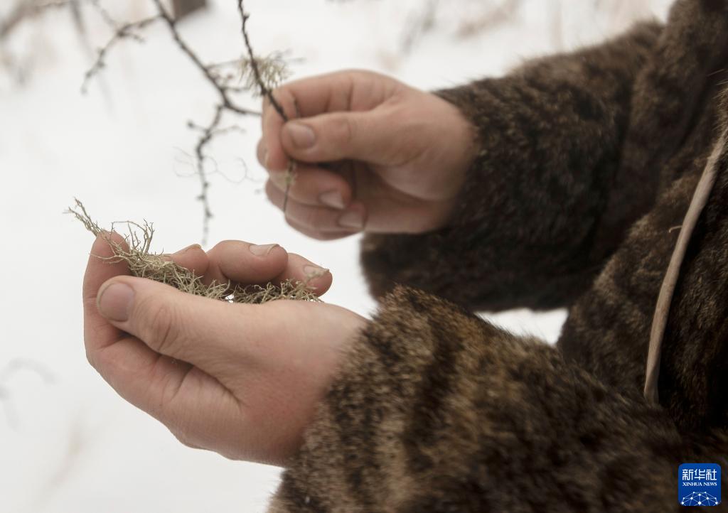 1月12日,覺(jué)樂(lè )在查看樹(shù)上的苔蘚,這種苔蘚是馴鹿最喜歡的食物。新華社記者 費茂華 攝