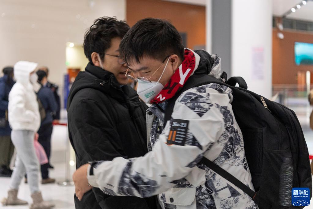 1月12日,在綏芬河公路口岸旅檢大廳,入境旅客與許久不見(jiàn)的親友擁抱。