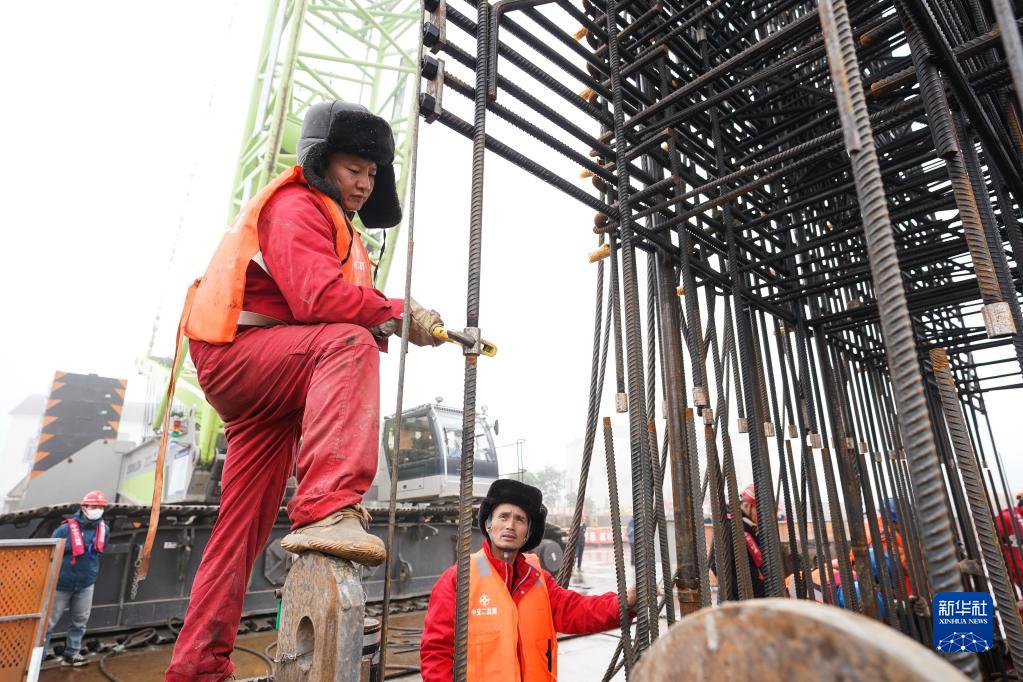 1月13日,工人在張靖皋長(cháng)江大橋南航道橋南錨碇施工現場(chǎng)作業(yè)。