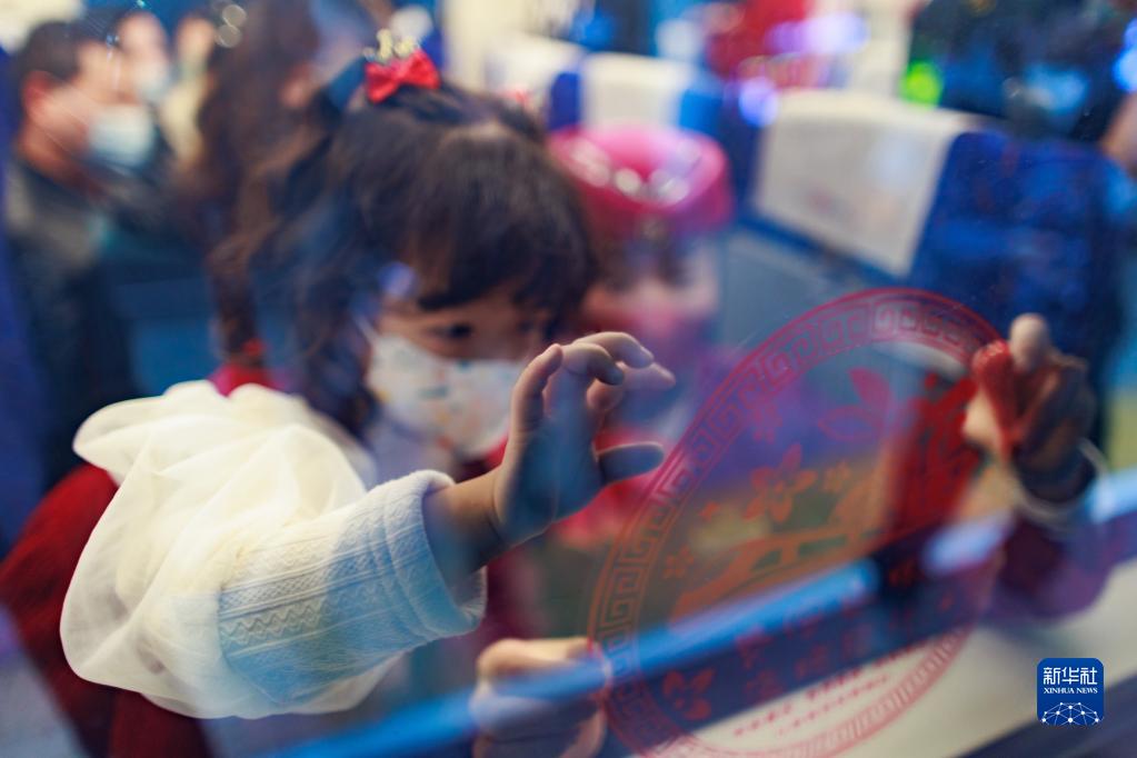 1月13日,一名小旅客在C5980次列車(chē)上貼窗花。